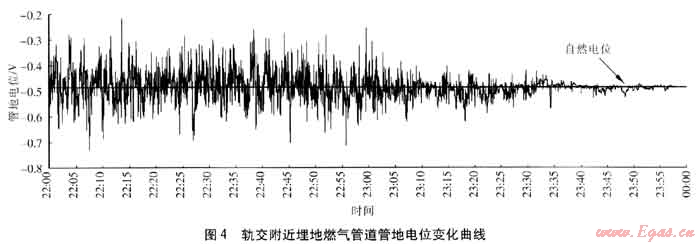 以管道未受干擾時的自然電位為基準(zhǔn),雜散電流流入?yún)^(qū),管地電位負(fù)向偏移,管道處于陰極區(qū)受到保護(hù);雜散電流流出區(qū),管地電位正向偏移,管道為陽極區(qū)發(fā)生腐蝕,必須采取防護(hù)措施。對于動態(tài)雜散電流干擾,管道陰極區(qū)和陽極區(qū)分布是動態(tài)變化的,管道某點可能處于雜散電流流入、流出交替變化中,為管道雜散電流腐蝕判定及防護(hù)帶來一定的困難。對上海市某軌道交通旁的埋地燃?xì)夤艿拦艿仉娢贿M(jìn)行實時監(jiān)測,變化如圖4,測試過程中將犧牲陽極斷開,以軌交停運(yùn)后管地電位平均值作為自然電位。在軌交運(yùn)行期間多列機(jī)車通過測試點,管地電位相對自然電位正負(fù)交替變化,電位正向和負(fù)向偏移均比較明顯。