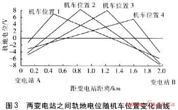 雜散電流的變化與雜散電流源的變化具有一致性,軌交雜散電流的大小隨軌交系統(tǒng)的用途、機(jī)車的相對位置和運(yùn)行狀態(tài)不同而變化。機(jī)車在每兩個站臺之間都要經(jīng)歷加速、勻速、減速的過程,不同運(yùn)行狀態(tài)下機(jī)車電流不同。隨機(jī)車電流及機(jī)車位置的變化,軌道電流和軌道對地電位(簡稱軌地電位)也處于變化中,圖3為兩變電站之間軌地電位隨機(jī)車位置變化曲線。軌地電位為正時,雜散電流流入大地,軌地電位為負(fù)時,雜散電流返回鋼軌。鋼軌泄漏電流位置的變化使得埋地管道對地電位(簡稱管地電位)處于不斷變化之中,管道發(fā)生雜散電流腐蝕的位置和強(qiáng)度也在不斷變化[8]。