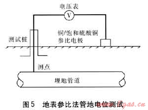土壤和管道中有電流流過時總會引起電位的變化,通過管地電位偏移可以對雜散電流影響進(jìn)行判定。管地電位指埋地燃?xì)夤艿琅c對應(yīng)參比電極之間的電位差。根據(jù)參比電極位置不同有直接參比法、地表參比法、近參比法、遠(yuǎn)參比法等。地表參比法管地電位測試接線見圖5。對于管地電位波動頻繁地區(qū),可采用電子記錄儀表代替?zhèn)鹘y(tǒng)電壓表,引申為管地電位連續(xù)監(jiān)測法。