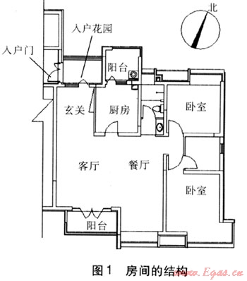 本文以某居住建筑為實例進行分析計算,該建筑各層層高為2.9m,共13層,房間的結構(另一側為對稱結構)見圖1。該居住建筑按照2007版的建筑節(jié)能標準設計,其設計節(jié)能率為65%,合理使用年限為50年。建筑面積為5083.2m2,建筑體積為14741.28m3,建筑表面積為4189.98m2,窗墻比分別為:南向0.45,東向0.11,西向0.11,北向0.24。