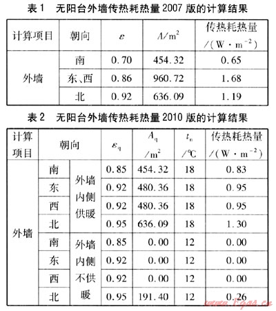 無陽臺外墻傳熱耗熱量,采用2007版的計算方法時,由式(2)得到的計算結果見表1。采用2010版的計算方法時,由式(4)得到的計算結果見表2。由表1、2可知:2010版的外墻傳熱系數修正系數大于2007版。2007版中內側不供暖外墻不參與耗熱量計算,在內側不供暖外墻耗熱量不參與比較時,2010版計算得到的外墻傳熱耗熱量為4.03W/m2,仍大于2007版的計算結果(3.52W/m2)。由此可知,外墻傳熱系數修正系數和供暖室內計算溫度的選取對于外墻傳熱耗熱量的影響比較大。