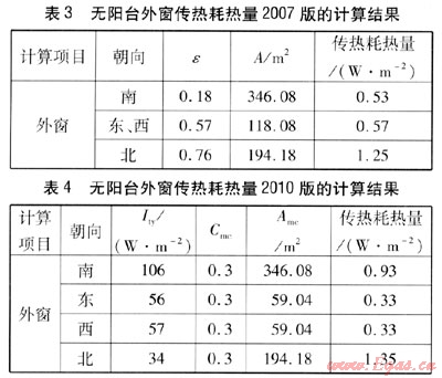 無陽臺外窗傳熱耗熱量,采用2007版的計算方法時,由式(2)得到的計算結果見表3。采用2010版的計算方法時,由式(5)、(6)得到的計算結果見表4。由表3、4可知,由2010版計算得到的計算結果大于2007版,說明2007版中無陽臺外窗傳熱耗熱量計算中采用一個綜合修正系數強化了太陽輻射得熱對外窗傳熱耗熱量的影響。