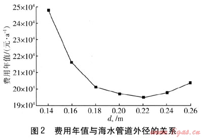 在θn,s=70℃,θn,r=50℃,θs,in=12℃,θs,out=8.6℃,θm,in=4℃,θm,out=8.2℃,以及海水流量為102.86m3/h,中介水流量為98.05m3/h的條件下,費(fèi)用年值與ds的關(guān)系見圖2。由圖2可知,隨著ds的增加,費(fèi)用年值降低很快,這是由于海水流速的降低使阻力降低,海水泵的耗電量降低。達(dá)到最低點(diǎn)(對(duì)應(yīng)最優(yōu)管徑)后,管徑繼續(xù)增加,管道造價(jià)增加較大,引起費(fèi)用年值增加。