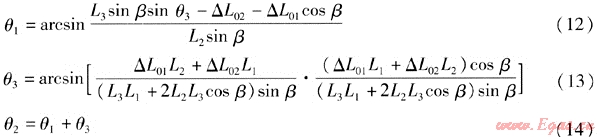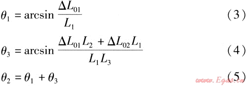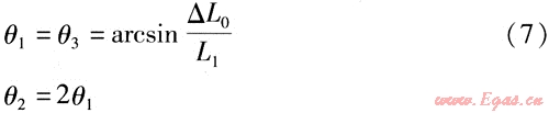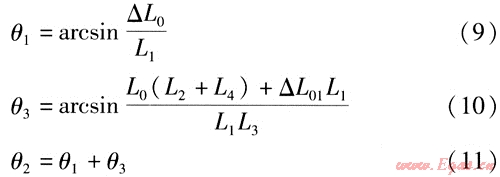 鉸鏈波紋管補(bǔ)償器吸收管道熱位移后,通過2個(gè)或3個(gè)補(bǔ)償器組成的補(bǔ)償系統(tǒng)角度的變化補(bǔ)償管段的熱位移。運(yùn)用理論力學(xué)對(duì)鉸鏈波紋管補(bǔ)償器變形簡(jiǎn)化模型進(jìn)行分析,得到幾種典型布置形式及吸收熱位移后的角位移計(jì)算式。在各典型管系的管道布置形式中:S1~S3為鉸鏈波紋管補(bǔ)償器編號(hào);L0、L01、L02、L1、L2、L3、L4為對(duì)應(yīng)管段長(zhǎng)度,單位為m;△L0、△L01、△L02為長(zhǎng)度為L(zhǎng)0、L01、L02管段的熱位移,單位為m。熱位移計(jì)算式為: