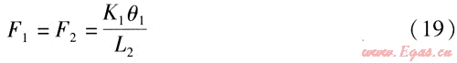 鉸鏈波紋管補(bǔ)償器具有較高強(qiáng)度,可以傳遞荷載,并由于自身構(gòu)件承受管道介質(zhì)的內(nèi)壓推力(盲板力),作用在固定支座上的力很小,方便了管道系統(tǒng)的設(shè)計(jì)以及固定支座的設(shè)計(jì)與施工。6種典型管系中固定支座的受力分析見圖1~6,F(xiàn)1、F2為鉸鏈波紋管補(bǔ)償器作用在固定支座上的力,單位為N。6種典型管系中鉸鏈波紋管補(bǔ)償器工作時(shí)作用在固定支座上力的計(jì)算如下。