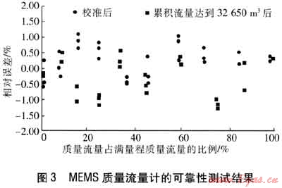 用于城市天然氣計(jì)量的質(zhì)量流量計(jì),其可靠性十分重要,可靠性故障會(huì)給燃?xì)夤芾韼砝щy,甚至引起貿(mào)易糾紛。在MEMS質(zhì)量流量計(jì)的可靠性測(cè)試中,采用了加速實(shí)驗(yàn)的方法。一臺(tái)管徑為32mm,最大標(biāo)稱流量為16m3/h的MEMS質(zhì)量流量計(jì)在校準(zhǔn)后和累積流量達(dá)到32650m3后的質(zhì)量流量相對(duì)誤差見圖3,同一工況、同一質(zhì)量流量下的3個(gè)相對(duì)誤差值代表3次重復(fù)性測(cè)量的結(jié)果(圖3中有些點(diǎn)重合)。該MEMS質(zhì)量流量計(jì)適用于小型餐飲用戶等的天然氣計(jì)量,這類用戶平均每天用氣約6h,平均小時(shí)流量約為8m3/h,因此32650m3的天然氣約需要使用2年。由圖3可知,累積使用2年后,MEMS質(zhì)量流量計(jì)的測(cè)量精度仍能滿足要求。