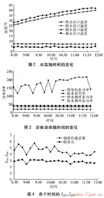 測試時間為2011年1月12日至14日,每天8:30—11:50,測試時間間隔為10min,確定系統(tǒng)運行基本穩(wěn)定后進行測試。測試數(shù)據(jù)包括:熱泵機組功率、熱水循環(huán)泵功率、取水泵功率、取水循環(huán)泵功率、熱泵機組熱水進出口溫度和流量、熱泵機組湖水進出口溫度和流量。取水系統(tǒng)原設計采用變頻控制,但測試時變頻器未最終調(diào)試完成,因此取水系統(tǒng)采用定流量運行。熱水循環(huán)系統(tǒng)也采用定流量運行。