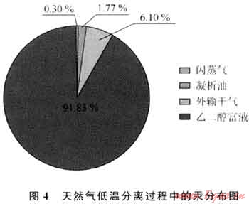 2) 原料氣中的汞絕大多數(shù)進入了乙二醇富液中,乙二醇對汞的富集作用十分明顯;少數(shù)汞進入了外輸干氣中,外輸干氣的汞含量約比原料氣的汞含量低一個數(shù)量級,低溫分離過程可有效降低外輸干氣中的汞濃度;極少數(shù)汞進入了凝析油和三相分離器閃蒸氣中。