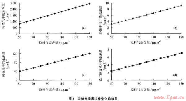 3) 乙二醇富液、外輸干氣、凝析油和閃蒸氣中的汞含量隨著原料氣中汞含量的增加而增加,其趨勢依次減弱,乙二醇富液中汞含量增加的趨勢最顯著,閃蒸氣中汞含量增加的趨勢最弱。