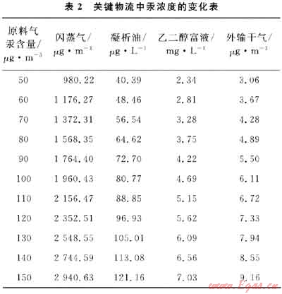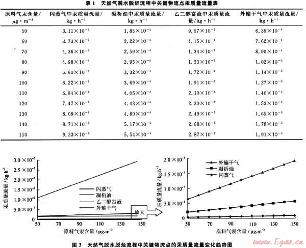 2) 含汞天然氣經(jīng)過低溫分離后,絕大多數(shù)汞進入了乙二醇富液,經(jīng)乙二醇再生后進入再生塔塔頂未凝氣及污水中;少數(shù)汞進入了外輸干氣中;極少數(shù)汞進入了三相分離器閃蒸氣相、未穩(wěn)定的凝析油和乙二醇貧液中。