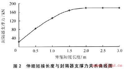 封隔器安全坐封力為9.07t,而壓裂時坐封力為21.1kN,小于封隔器安全坐封力,同時封隔器對套管作用力達460.26kN。元壩2井事故分析結果為:施工中封隔器承受上頂力較大,膠皮密封不嚴,存在柒性竄漏,同以上理論計算結果相符合。因此,采用本研究方法設計伸縮短接,針對管柱受力最惡劣的擠酸工況,采用不同伸縮短接長度對封隔器支撐力進行敏感性分析,分析結果如圖2所示。