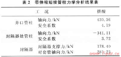 通過以上敏感性分析,設計1.7m伸縮短接便可有效補償擠酸工況管柱變形附加力。以下對安裝伸縮短接后的管柱進行力學分析和強度校核,結果見表2。