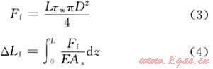 對于帶封隔器井下管柱,隨著井筒壓力、溫度等參數(shù)變化而產(chǎn)生溫度效應、活塞效應、鼓脹效應、螺旋彎曲效應。對這4個基本效應產(chǎn)生的管柱變形及其變形力,國內(nèi)外學者已經(jīng)做了大量研究,此不贅述。對于深層氣井,高速擠酸過程中,流體粘滯摩阻效應是引起管柱變形的重要因素,也是造成管柱、封隔器失效的主要原因。因此,在分析管柱變形時除了要考慮上述4種基本效應外,還必須考慮流體粘滯摩阻效應,粘滯摩阻力(Ff)和摩阻效應變形(△Lf)分別由下式表示[7~8]: