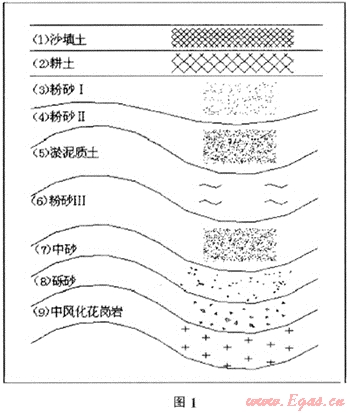 福建省沿海地區(qū)多是海相沉積地質(zhì),其中漳州九龍江平原地質(zhì)多屬于淤泥質(zhì)軟土地區(qū),從該建筑場地地質(zhì)勘探報告表明,場地為Ⅲ類軟土地基,主要含飽和淤泥和可液化砂層,土層分布如圖1所示[1]。從地質(zhì)勘探報告上看,軟土地質(zhì)是造成建筑物沉降最基礎(chǔ)性的原因。
