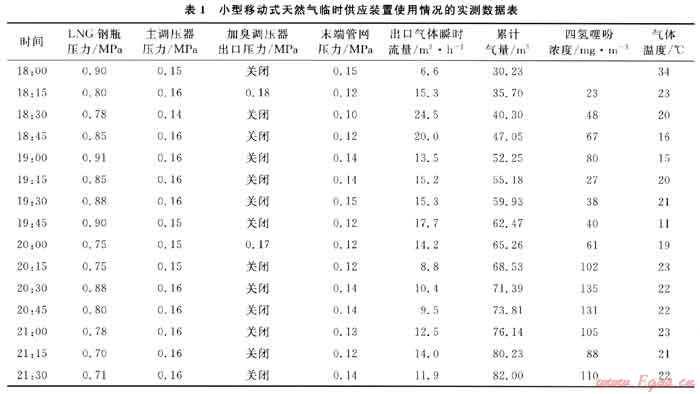 采用小型移動式天然氣臨時供應裝置為5棟28層的高層樓宇供氣,每套調(diào)壓加臭箱備有4個LNG鋼瓶重瓶,表1為該裝置晚間高峰用氣時段(18:00-21:30)為其中一棟樓宇236戶居民用戶供氣情況的實測數(shù)據(jù)(每隔15min記錄1次)。