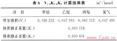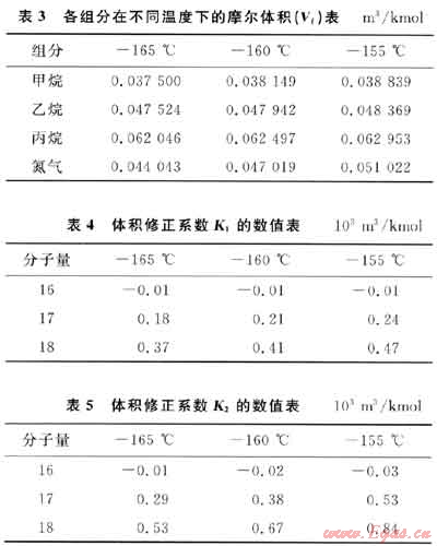 根據(jù)LNG液相平均溫度與混合物分子量(M),可以在表3~5中利用線性插值法求得相應溫度下各組分的摩爾體積(Vi)與體積修正系數(shù)(K1、K2)值,結(jié)果見表6。