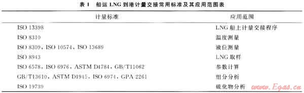 目前,全球LNG接收站(包括國內(nèi)已經(jīng)投入運營的廣東大鵬LNG、上海LNG和福建LNG接收站)的到港計量交接多采用IS0、ASTM、GPA等制訂的國際標準[14],常用標準及其應用范圍如表1所示。國家標準GB/T 11062、GB/T 13610等均為同等或非等效采用相應的國際標準;另外,由于國內(nèi)LNG工業(yè)尚處于起步階段且LNG買賣均涉及外方,因此,相關(guān)國家標準在實際LNG到港計量交接中尚未得到廣泛的應用[15~16]。