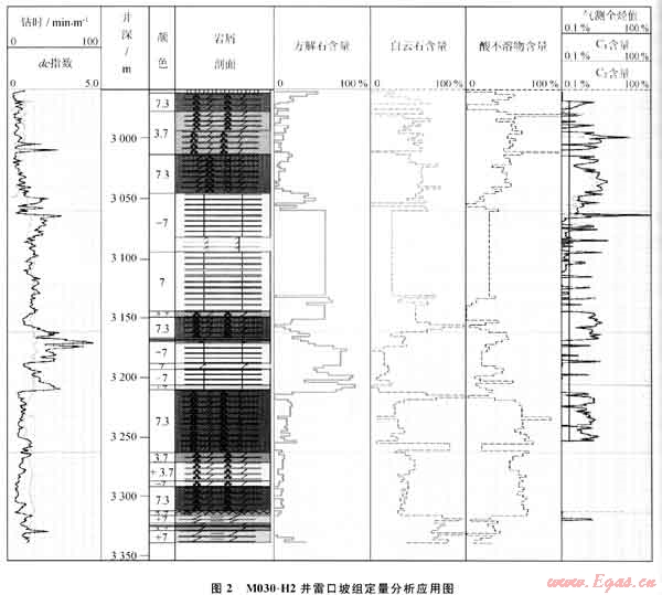 針對(duì)碳酸鹽巖地層,顯微識(shí)別定量分析巖性存在困難,應(yīng)用碳酸鹽巖定量分析技術(shù),對(duì)M030-H2井進(jìn)行分析,在2961~3046m、3148~3164m、3208~3308m儲(chǔ)層段,顯示方解石含量低,白云石含量高,對(duì)應(yīng)綜合錄井參數(shù)為低鉆時(shí),高氣測(cè)值段。證實(shí)碳酸鹽巖定量分析獲得的方解石、白云石、酸不溶物含量與巖屑剖面、鉆時(shí)、氣測(cè)等資料對(duì)比吻合性較好,快速識(shí)別出白云巖儲(chǔ)層(圖2)。