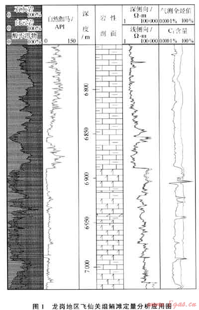 在四川盆地龍崗地區(qū)飛仙關(guān)組鉆進(jìn)中,應(yīng)用碳酸鹽巖定量分析技術(shù)對(duì)龍崗地區(qū)3口井進(jìn)行了采樣分析。從其中一口井的分析可見(jiàn)(圖1),在6750~6890m儲(chǔ)層段,酸不溶物、石灰質(zhì)含量高,與上部泥灰?guī)r的自然伽馬高值、雙側(cè)向低值對(duì)應(yīng)較好;在6890~6992m儲(chǔ)層段,白云質(zhì)含量出現(xiàn)至高值,與鮞灘白云巖的自然伽馬低值、雙側(cè)向高值顯示吻合較好睜…,為判斷飛仙關(guān)組鮞灘儲(chǔ)層提供了可靠依據(jù)。但酸不溶物含量偏高,與鮞灘儲(chǔ)層物性相關(guān)性稍差。