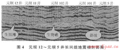 元壩地區(qū)長興組某方向的地震剖面(圖4)顯示地震相特征主要表現(xiàn)為臺地邊緣淺灘相、臺地邊緣生物礁相及礁前斜坡相,與測井相所反映的沉積特征一致。臺地邊緣生物礁為“低頻、弱振幅、內(nèi)部雜亂、透鏡狀反射結(jié)構(gòu)”地震相特征[7],一般外形上頂部上拱隆起形成披蓋構(gòu)造和側(cè)面上超形態(tài),呈丘狀,這與臺地邊緣生物礁沉積體的“含弱反射的隆起”特征類似,為典型生物礁沉積特征,如元壩102、元壩101井區(qū)地震相沉積特征。臺地邊緣淺灘,常發(fā)育碎屑灘,這些碎屑顆粒往往是由海浪拍打生物礁形成的,地震剖面上呈“斷續(xù)、斜交、中強振幅反射”的地震相特征,如元壩12、元壩11井井區(qū)為礁后淺灘沉積特征。臺地邊緣往陸棚過渡,水動力條件逐漸減弱,巖性泥質(zhì)含量增多,反射波組呈平行、亞平行反射,并有同相軸增多現(xiàn)象,如元壩5井井區(qū)為礁前斜坡沉積特征。
