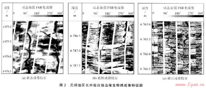 研究區(qū)大部分井都已取全取準(zhǔn)了成像測井資料,利用成像測井對元壩地區(qū)長興組礁灘相儲層的沉積微相做進一步刻畫顯得尤為重要。通過對本區(qū)鉆井的成像測井信息與沉積微相的地質(zhì)信息進行對比分析表明,礁蓋、礁核是最有利于元壩長興組礁灘相優(yōu)質(zhì)儲層發(fā)育的沉積微相。