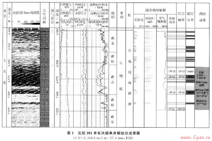 在區(qū)域地質(zhì)背景分析的基礎(chǔ)上,綜合利用成像測井、常規(guī)測井及巖屑薄片鑒定等資料,結(jié)合實際鉆探成果進行了研究區(qū)長興組的單井相劃分。以元壩101井單井相劃分為例(圖1),圖中顯示該段地層自然伽馬低值,約10API,巖性純,以淺灰色白云巖、溶孔白云巖及生屑灰?guī)r為主,夾有云質(zhì)灰?guī)r和含云灰?guī)r;成像圖像上可見6900~6925m和6950~7000m裂縫及溶蝕孔洞非常發(fā)育,對應(yīng)的孔隙度曲線明顯增大,儲集物性好,電阻率曲線較致密圍巖明顯降低,呈大幅度正差異特征,儲層滲透性好。這些特征反映當(dāng)時的沉積水體相對較淺,沉積水體能量較強,白云巖化作用較強,易形成溶蝕孔洞白云巖儲層,為臺地邊緣生物礁儲層沉積特征。取心資料顯示,該井段含有大量生物碎屑,這些生屑多為有孔蟲類、腕足類及鰱的化石,而這些生物正是區(qū)域上長興組沉積時期生物礁的附礁生物[2];結(jié)合研究區(qū)所有單井的長興組沉積相分析結(jié)果,綜合認(rèn)為該地層屬于臺地邊緣礁灘相沉積。