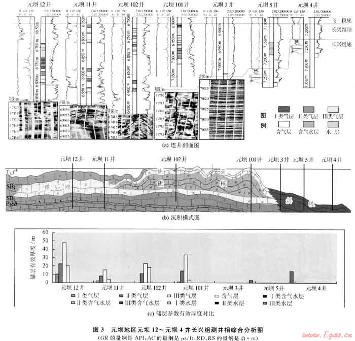 曲線特征及連井相對比分析表明,不同的沉積相帶測井特征存在較大差異(圖3),元壩12、元壩11井長興組自然伽馬平均值為15API,巖性為淺灰色生屑灰?guī)r、深灰色含云生屑灰?guī)r,儲集物性較好,成像圖上裂縫及溶蝕孔洞發(fā)育,取心見鰱類化石、海綿骨針、苔蘚蟲、有孔蟲等,測井相為臺地邊緣礁灘相,亞相為礁后淺灘,有利于儲層發(fā)育的沉積微相為生屑灘和砂屑灘.元壩102、元壩101井長興組自然伽馬平均值為10API,巖性以白云巖、灰質(zhì)云巖及云質(zhì)灰?guī)r為主,儲集物性好,成像圖上高角度縫、網(wǎng)狀縫及溶蝕孔洞發(fā)育,取心見孔蟲類、腕足類及筵的化石等,測井相為臺地邊緣礁灘相,亞相為生物礁,具有利于儲層發(fā)育的礁蓋和礁核沉積微相特征;而過渡到元壩3~元壩4井長興組自然伽馬逐漸增大,平均值由21API增加至27API,泥質(zhì)含量相對較重,巖性以含泥灰?guī)r為主,儲集物性差,成像圖上層理發(fā)育,儲層不發(fā)育,其測井相為斜坡-淺水陸棚沉積[6]。同時,儲層參數(shù)橫向?qū)Ρ?圖3-c)反映元壩12~元壩101井儲層發(fā)育,儲集物性好,以Ⅱ、Ⅲ類儲層為主,儲層含氣性好,測試獲得天然氣產(chǎn)能為30×104~120×104m3/a,可能為臺地邊緣礁灘相沉積特征。