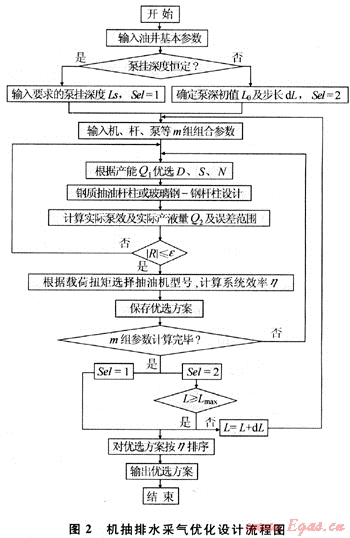 根據(jù)排水采氣井的地質(zhì)資料、生產(chǎn)數(shù)據(jù)、測井資料等數(shù)據(jù),在目前較為成熟的理論研究成果的基礎上,通過進一步對機抽井的理論研究工作,研制出了“機抽排水采氣系統(tǒng)優(yōu)化設計軟件”。該軟件分為機抽井校核、機抽井設計、轉抽井設計、機抽井管理、機抽井診斷、實測系統(tǒng)效率計算、軟件幫助7大子系統(tǒng)[4~5]。應用該軟件,在供排協(xié)調(diào)條件下對機一桿一泵系統(tǒng)進行優(yōu)化設計與參數(shù)、設備等的優(yōu)選,其優(yōu)化設計流程如圖2所示。