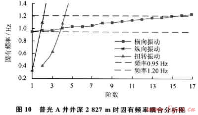 1) 鉆柱扭轉(zhuǎn)振動(dòng)和縱向振動(dòng)固有頻率數(shù)值較大,各階固有頻率之間間隔較大,可選擇的安全轉(zhuǎn)速范圍較寬;但橫向振動(dòng)低階固有頻率數(shù)值很小且各階固有頻率之間間隔很小,可選擇的安全轉(zhuǎn)速范圍較窄。