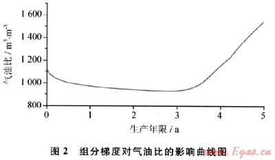 由于重力分離的作用,凝析氣藏在縱向上存在組分梯度,即隨深度的增加,凝析氣藏的組分會發(fā)生變化,流體變重。而某些凝析氣藏的組分梯度很明顯,如雅克拉和大澇壩凝析氣藏。而在對氣井進行射孔時,為了減小邊、底水的影響,一般選擇對儲層的上部進行射孔,這就造成氣井剛開始生產(chǎn)的凝析氣主要為深度較淺的流體,這些凝析氣相對于更深的凝析氣來說組分較輕,因此剛開始生產(chǎn)時的氣油比較高,而隨著開采的繼續(xù),將采出更多的深層較重的凝析氣,這就造成生產(chǎn)氣油比的下降。