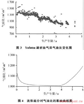 某些凝析氣藏在形成時,由于自然對流和熱擴散的作用[5],導致流體重組分含量隨深度的增加而減小,即氣藏頂部的流體最重,隨深度的增加,重組分含量逐漸減小,如日本的Yufutsu凝析油氣田。該氣田部分直井選擇在儲層的下部進行射孔,這就造成剛開始生產(chǎn)時的流體較輕,氣油比較高,而隨著開采的繼續(xù),將采出更多的淺層較重的凝析氣,這就造成生產(chǎn)氣油比的下降(圖3)。