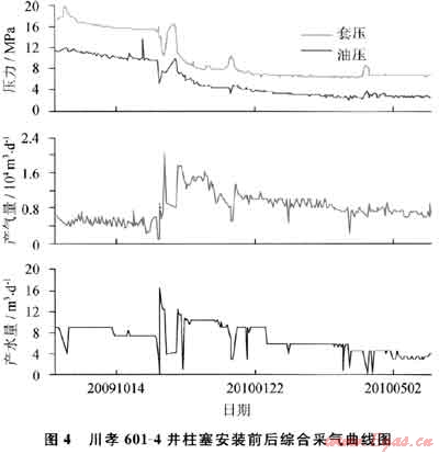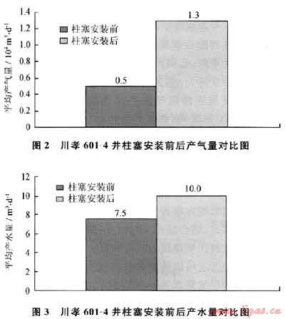 川孝601-4井施工前產(chǎn)氣0.5×104m3/d,產(chǎn)水7.5m3/d;施工后產(chǎn)氣1.3×104m3/d,產(chǎn)水10m3/d,增產(chǎn)天然氣0.8×104m3/d,排水采氣效果顯著。綜合采氣曲線(xiàn)可以看出:該井自安裝柱塞氣舉以來(lái),油套壓差減小,產(chǎn)氣量顯著增加,排水采氣效果明顯。柱塞氣舉安裝前后產(chǎn)量對(duì)比如圖2、3所示,柱塞安裝前后綜合采氣曲線(xiàn)如圖4所示。