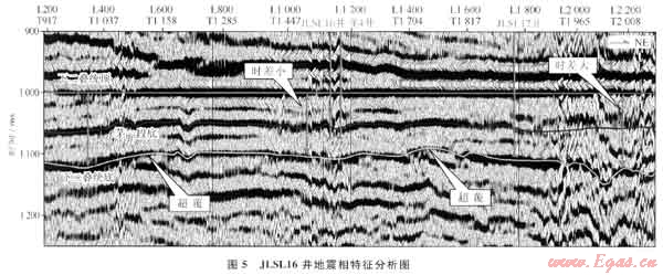 本次預測成果經JLSL16井實鉆證實,在茅口組獲氣,從平面成果圖分析,JLSL16井應與龍4井具有相似的沉積環(huán)境。圖5為過JLSL16井下二疊統(tǒng)頂層拉平地震剖面(該測線為圖4中測線B),圖中3種不同的地震相特均表明JLSL16井在茅三時期該區(qū)域為灘相儲層發(fā)育有利區(qū),預測成果與實鉆結果吻合。