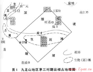 勘探實踐表明:川西九龍山地區(qū)下二疊統(tǒng)有利的儲集相帶為棲二段、茅三段灘相,這類灘相沉積時水體較淺,大多為潮間和潮下的高能環(huán)境,各類粒屑灰(云)巖較發(fā)育。由于這類粒屑灰(云)巖的結構較粗、質純、性脆,故在沉積、成巖過程中易被改造而產生多種空隙,包括一些原生孔隙、各種次生孔隙和構造裂縫,從而改善碳酸鹽巖的儲滲性能,成為油氣富集的有利場所。