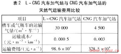 由于加氣站總運(yùn)營費(fèi)用的90%以上是用于購買和運(yùn)輸天然氣,因此從氣源點(diǎn)到加氣站的運(yùn)輸成本對加氣站的運(yùn)行費(fèi)用產(chǎn)生很大影響,進(jìn)而影響加氣價格。L-CNG汽車加氣站與CNG汽車加氣站的天然氣運(yùn)輸費(fèi)用比較見表2。