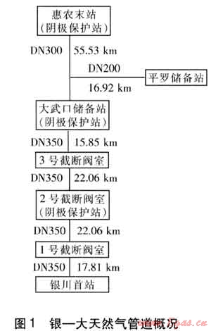 石嘴山市天然氣工程管道(簡(jiǎn)稱銀-大天然氣管道)起點(diǎn)為銀川的銀川首站,在大武口區(qū)和平羅縣分別設(shè)分輸站,末站設(shè)在惠農(nóng)區(qū)的煤氣廠。該管道全長(zhǎng)150.23km,管道規(guī)格分別為DN 350、300、200mm,設(shè)計(jì)年輸氣能力為6×108m3/a。該管道距離較長(zhǎng),采用強(qiáng)制電流陰極保護(hù)。銀-大天然氣工程管道概況見(jiàn)圖1。