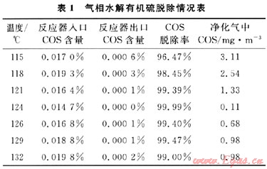 1) 應(yīng)用氣相水解法脫除有機(jī)硫工藝,可以有效脫除原料氣中的COS,凈化氣中COS<70mg/m。