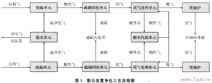 高含硫原料氣經(jīng)過(guò)脫硫單元脫除幾乎所有的H2S、部分有機(jī)硫及C02,再經(jīng)過(guò)脫水單元脫水后,合格凈化氣出裝置外輸。脫硫單元產(chǎn)生的含有H2S的酸性氣體進(jìn)入硫磺回收單元,將硫元素回收為液硫,送出裝置,經(jīng)成型后運(yùn)至硫磺儲(chǔ)運(yùn)系統(tǒng)并外銷(xiāo)。硫磺回收單元的尾氣經(jīng)過(guò)尾氣處理單元凈化處理,凈化后的尾氣送至尾氣焚燒爐焚燒后,產(chǎn)生的煙氣能滿足國(guó)家環(huán)保要求,經(jīng)煙囪排入大氣;產(chǎn)生的酸性水送至酸性水汽提單元,汽提出的。酸性氣體送至尾氣處理單元凈化處理,而處理后合格的凈化水則送至循環(huán)水廠循環(huán)使用。