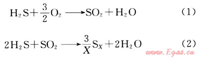 采用技術(shù)成熟的常規(guī)Claus工藝[5],從酸性氣中回收元素硫。脫硫單元采出的全部酸性氣進(jìn)入反應(yīng)爐,按酸性氣中攜帶烴類(lèi)完全燃燒且1/3的H2S生成S02控制進(jìn)入反應(yīng)爐的燃燒空氣量。在反應(yīng)爐內(nèi)發(fā)生Claus反應(yīng):
