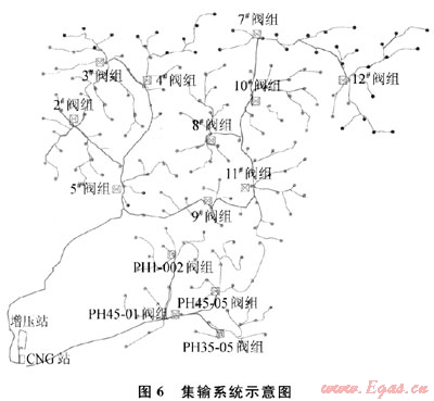 采用“分片集輸一級增壓”的集輸工藝,減少了中間場站增壓集輸環(huán)節(jié),優(yōu)化了集輸工藝,從而使采氣半徑大幅度增加,由相關(guān)規(guī)范上界定的“不宜大于5km”,增加到了17km,技術(shù)取得創(chuàng)新性重大突破,在相同規(guī)模氣田建設(shè)條件下,實現(xiàn)了由閥組代替集氣站,閥組與閥組之間的串聯(lián)枝狀布置,大大簡化了集輸設(shè)施,從而大幅度降低項目投資。這種集輸工藝在煤層氣田建設(shè)中首次應(yīng)用,取得了巨大成功,已申報國家發(fā)明專利(圖6)。