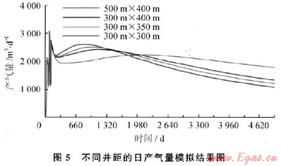 井間距是產(chǎn)量預(yù)測和經(jīng)濟(jì)評估的重要參數(shù),它決定著煤層氣開發(fā)的經(jīng)濟(jì)效益和煤層氣資源的回收率。井間距的大小取決于地質(zhì)條件、儲層性質(zhì)和生產(chǎn)規(guī)模對經(jīng)濟(jì)性的影響。為確定該區(qū)煤層氣開發(fā)合理的井網(wǎng)和井距,在儲層評價和歷史擬合的基礎(chǔ)上,利用先進(jìn)的儲層模擬軟件分別模擬了不同井間距的煤層氣產(chǎn)能(圖5)。針對不同井間距的布置,綜合應(yīng)考慮本區(qū)構(gòu)造裂隙和煤層主裂縫發(fā)育方向、煤層氣井產(chǎn)氣高峰期到達(dá)時間、氣井產(chǎn)能和煤層氣最終采收率等主要因素,對比分析并考慮經(jīng)濟(jì)評價的結(jié)果,在該地區(qū)采用300m×300m正方形井距布井最為經(jīng)濟(jì)合理,井網(wǎng)方位確定為N60°E方向和N30°W,在實際應(yīng)用中取得良好的效果,并在柿莊南、樊莊等地進(jìn)行推廣應(yīng)用。