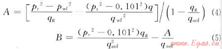 把氣井測(cè)試一點(diǎn)獲得的qg、pwf、pr數(shù)據(jù)代入式(7)求B值,再用一般二項(xiàng)式求A值,由此即可求得測(cè)試井的二項(xiàng)式和qaof。