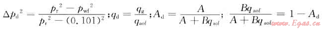 由一般二項(xiàng)式pr2-pwf2=Aqg+Bqg2和qaof表達(dá)式pr2-0.1012=Aqaof+Bqaof2推導(dǎo)出對(duì)比參數(shù)二項(xiàng)式,即△pd2=Aqd+(1-Ad)qd2,一點(diǎn)法二項(xiàng)式絕對(duì)無(wú)阻流量表達(dá)式為: