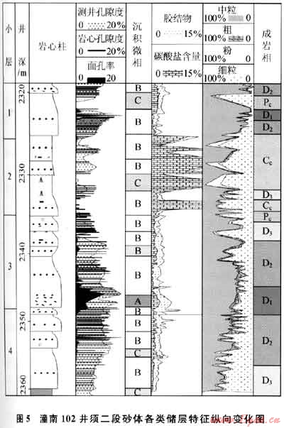 須二段大型復(fù)合砂體主要由4期河道遷移擺動形成的砂體組成,縱向上不同時(shí)期沉積砂體之間或同期砂體內(nèi)部的沉積韻律、微相組合、膠結(jié)物類型及其含量、成巖相類型及其組合以及孔隙度和面孔率等存在明顯差異,非均質(zhì)性較強(qiáng)。圖5為潼南102井須二段復(fù)合砂體沉積微相、成巖相和孔隙度的縱向變化圖,可見河道滯留微相(A)和砂壩相砂體(B)主要由粗?;蛑辛I敖M成,發(fā)育強(qiáng)溶蝕成巖相(D1)和中溶蝕成巖相(D2和D3),對應(yīng)的巖心孔隙度可超過7%,而溢流砂坪相砂層(C)及其上下地層由細(xì)粒粉砂和泥巖組成,常見機(jī)械壓實(shí)致密成巖相(Pc)和碳酸鹽充填成巖相(Cc),對應(yīng)孔隙度在2%~5%,以上現(xiàn)象說明沉積微相、成巖相和儲層物性三者之間的關(guān)系密切,儲層物性明顯受沉積微相和成巖相雙重控制,其中河道粗粒砂巖原生孔隙發(fā)育,有利于各類溶蝕作用的產(chǎn)生,形成中低孔滲儲集體,造成儲層非均質(zhì)性強(qiáng)。