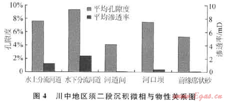 物性分析結(jié)果也顯示不同沉積微相的砂巖孔隙度和滲透率差異明顯(圖4),河道微相和砂壩相砂體與溢流砂坪相砂體相比,其平均滲透率級差可為2~3倍。利用300個(gè)巖樣滲透率分析的結(jié)果,結(jié)合前人對須二段物性分析的成果,繪制須二段滲透率平面分布圖,發(fā)現(xiàn)中高孔滲帶(孔隙度大于8%、滲透率大于0.1mD)主要沿主河道或次水道的流向分布,其中滲透率介于1~10mD的儲層面積約占整個(gè)砂體平面分布12%,滲透率為1~0.1mD的儲層面積約占整個(gè)砂體平面分布65%,滲透率為0.1~0.01mD的儲層面積約占整個(gè)砂體平面分布15%,滲透率小于0.01mD的儲層面積約占整個(gè)砂體平面分布8%,以上說明須二段儲層的平面非均質(zhì)性較強(qiáng)。