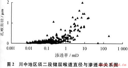 川中及川中-蜀南過渡帶須二段巖石類型主要為長石巖屑砂巖,含少量巖屑砂巖和長石石英砂巖,石英和巖屑含量中等,長石含量相對較高,分別平均為61.45%、1.97%和10.51%;其砂巖孔隙類型主要為粒間、粒內(nèi)溶孔、綠泥石襯邊的溶蝕孔和石英次生加大后的殘余粒間,以及少量雜基孔和微裂縫,面孔率約為10.73%,孔隙結(jié)構(gòu)以中孔細(xì)喉為主,局部發(fā)育小孔細(xì)喉和大孔細(xì)喉型組合。大量須二段巖心壓汞分析統(tǒng)計(jì)結(jié)果顯示(圖2),須二段砂巖的孔隙結(jié)構(gòu)非均質(zhì)性較強(qiáng),喉道直徑分布在0~2μm,變化范圍較大,其中直徑小于0.5μm的微孔喉和小孔喉體積分別占總體積的75%左右,大孔喉發(fā)育較少,并且當(dāng)孔喉直徑小于0.5μm時(shí),滲透率隨孔喉直徑變化呈指數(shù)函數(shù)增長,對滲透率的影響較為敏感。