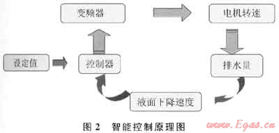 智能控制系統(tǒng)由地面部分和井下部分組成。通過采集井下壓力計(jì)或地面流量計(jì)信號,根據(jù)煤層氣單井排采規(guī)律,地面人工預(yù)先設(shè)定井底流壓變化值,由智能控制系統(tǒng)自動(dòng)閉環(huán)控制排采系統(tǒng)的工作參數(shù)(電機(jī)轉(zhuǎn)速或頻率),實(shí)現(xiàn)了井底流壓的智能控制。其控制原理如圖2所示。