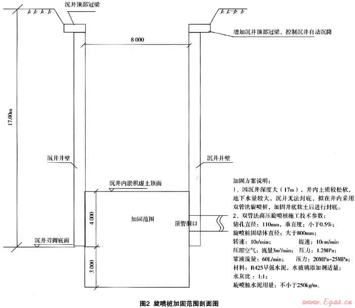 要加固沉井內(nèi)虛土,首先想到的是旋噴樁。眾所周知,旋噴樁是一種適合于加同軟土的很好地基處理方法,但其施工一般是在地面上進(jìn)行。旋噴樁若要在深度達(dá)17m、而其中上部還要架卒約13m的沉井內(nèi)施工卻是從未曾有人嘗試過。旋噴樁施工隊伍也擔(dān)心架空13m可能無法施工、加固效果很難保證。經(jīng)過仔細(xì)分析,我們大膽提出,只要采取的措施得法,旋噴樁是可以用于加固沉井內(nèi)虛土并起到止水作用的。通過現(xiàn)場指導(dǎo)施工,落實各項施工措施,最終證明,旋噴樁加固效果良好,虛土加固后,井底未出現(xiàn)涌砂、涌土現(xiàn)象,順利清除了井底虛土,保證了沉井順利封底。見圖1、圖2。