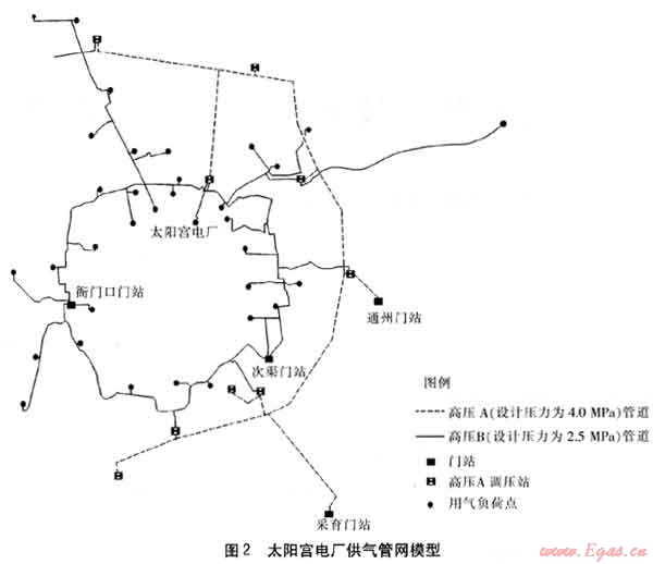 以北京市太陽宮天然氣發(fā)電廠為例,在建立北京市天然氣高壓管網(wǎng)模型的基礎上,對太陽宮電廠的兩臺9F機組在冬季用氣高峰進行啟停時的供氣管道水力工況進行動態(tài)模擬計算。建立的太陽宮電廠供氣管網(wǎng)模型見圖2,高壓A管道總長130km,高壓B管道總長180km。