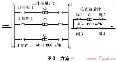 上述方案二中的流量計(jì)1和流量計(jì)2可以串聯(lián)達(dá)到互相核查的目的,但在更多流量計(jì)并聯(lián)組成的計(jì)量系統(tǒng)中就需要考慮設(shè)立單獨(dú)的核查流量計(jì)。如圖3,方案三中有工作流量計(jì)n臺,每臺流量計(jì)的測量范圍是80~1600m3/h,系統(tǒng)的測量范圍是(80~1600)n m3/h。核查流量計(jì)是一臺80~1600m3/h的流量計(jì)。正常工作時(shí),工作流量計(jì)根據(jù)供氣量,可以運(yùn)行在不同的開備組合下,核查流量計(jì)前后閥門1和閥門2關(guān)閉,閥門3和閥門4開啟,核查流量計(jì)不投入運(yùn)行。需要對工作流量計(jì)進(jìn)行核查比對時(shí),閥門1和閥門2開啟,閥門3和閥門4關(guān)閉,核查流量計(jì)投入運(yùn)行。通過閥門開閉,任何一臺工作流量計(jì)都可以和核查流量計(jì)形成串聯(lián)運(yùn)行,進(jìn)行核查比對。